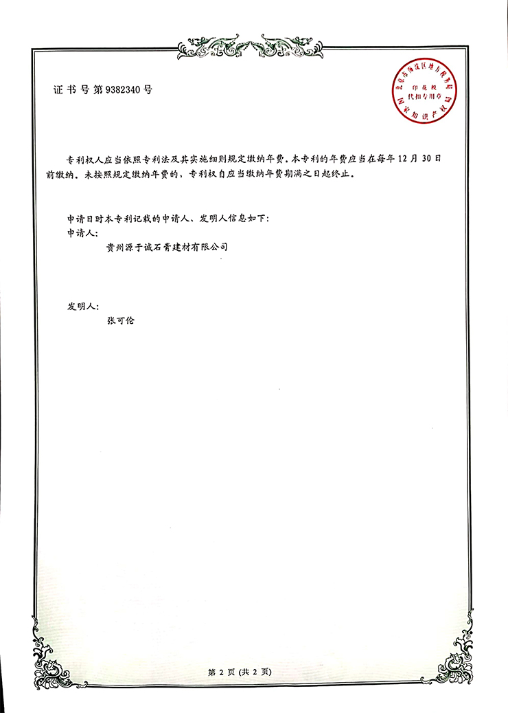 上一篇:專利證書(一種多功能紙面石膏板生產(chǎn)裝置)